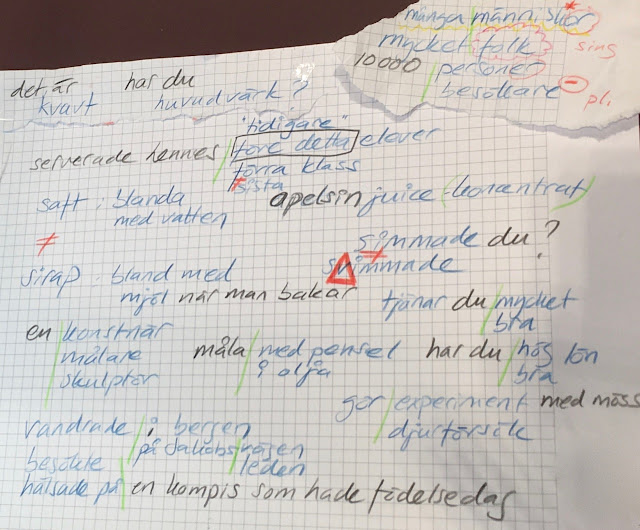 Vi kom också in på det svåra verbet bjuda, som vi först mötte i mejlet från Lotta (KB s.37) och nu igen i och med inbjudningskortet på s.61: